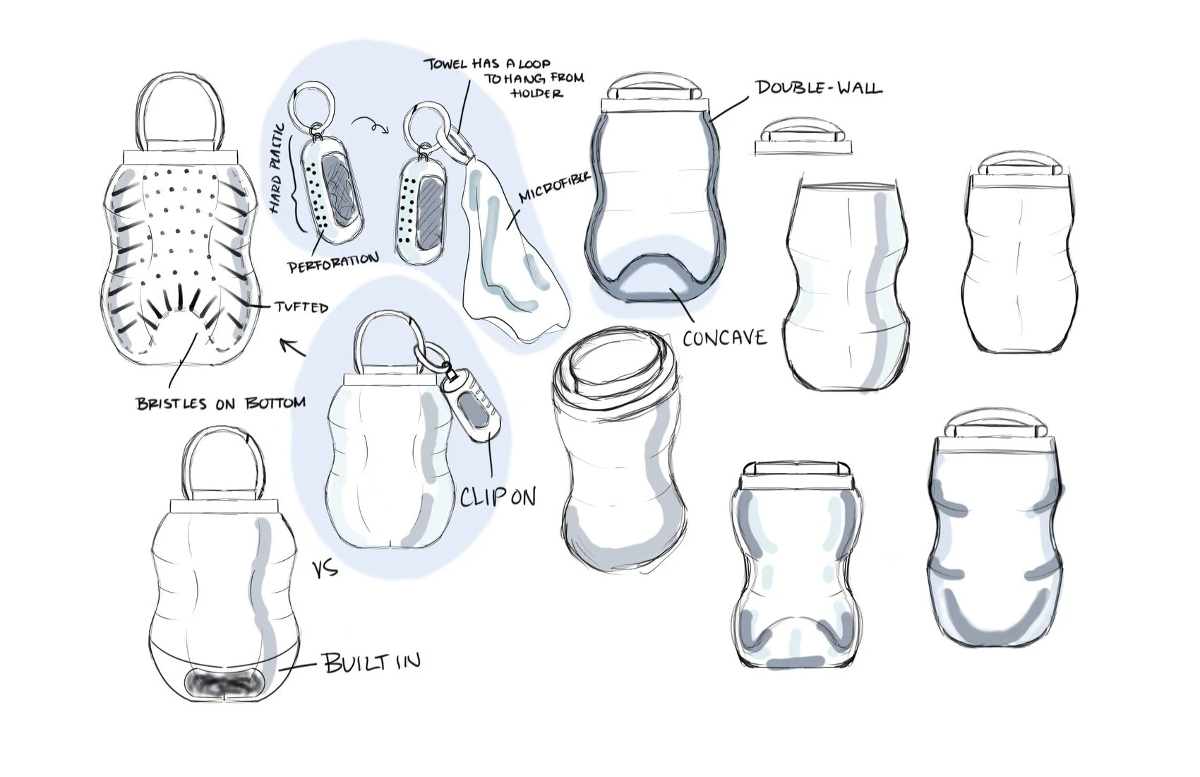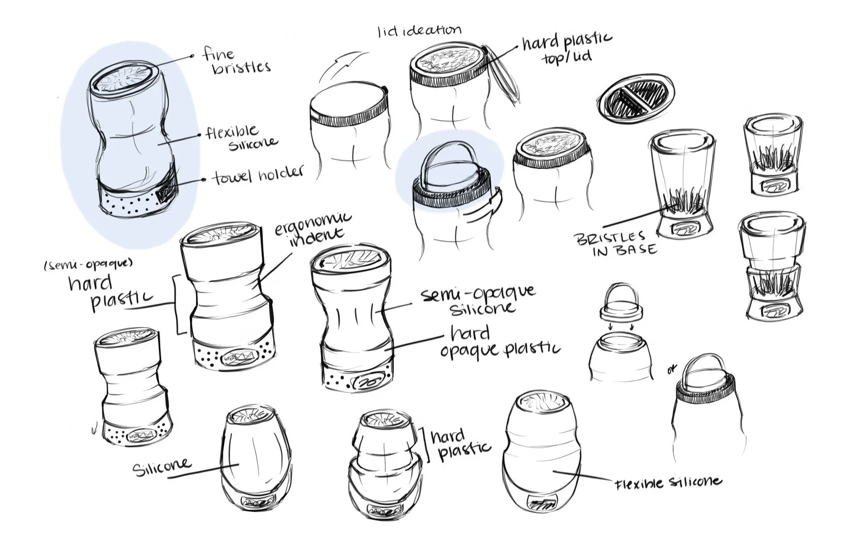 Experimenting and testing ergonomics, flexibility, bristle placement, and built in towel concept.