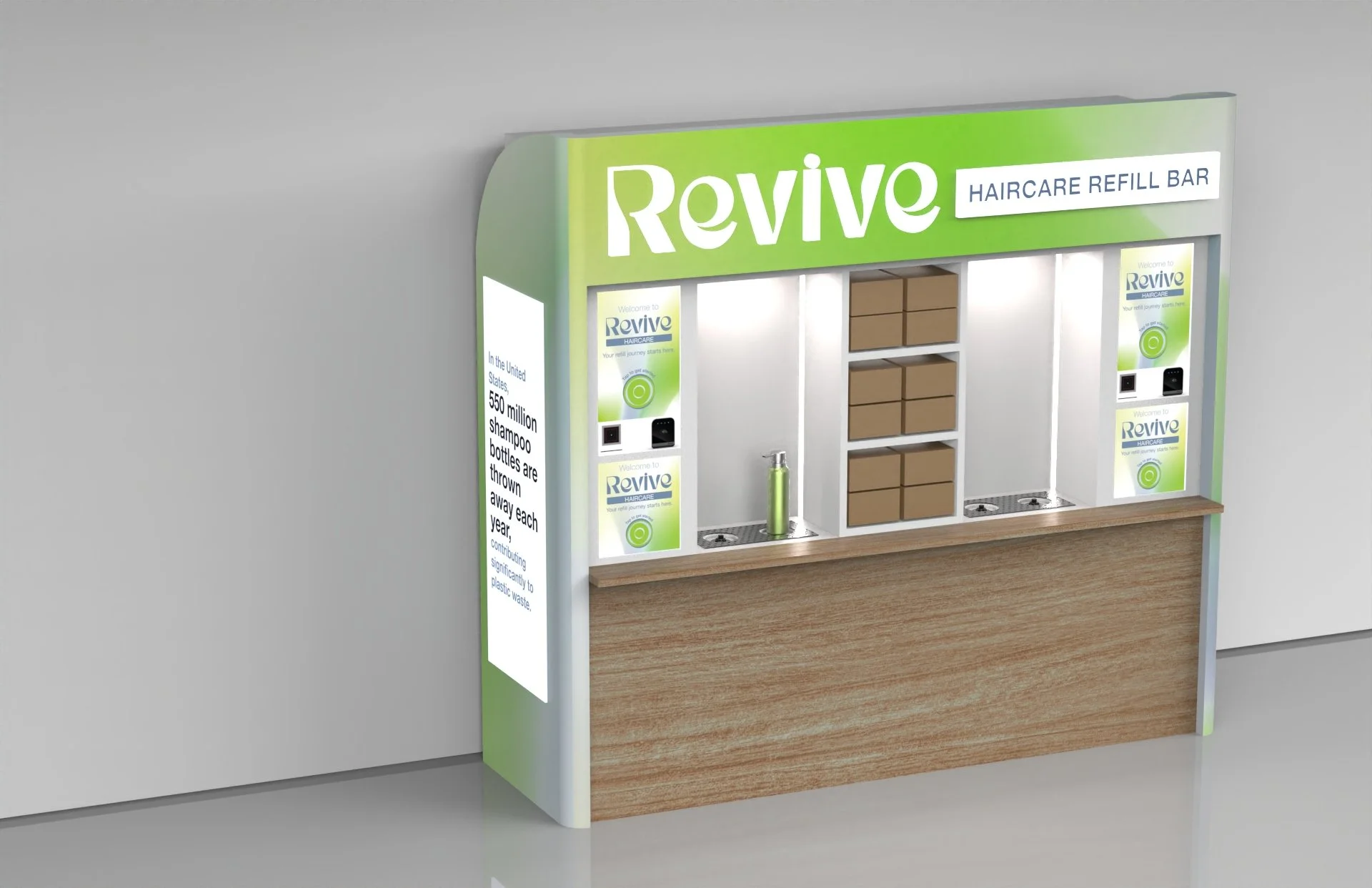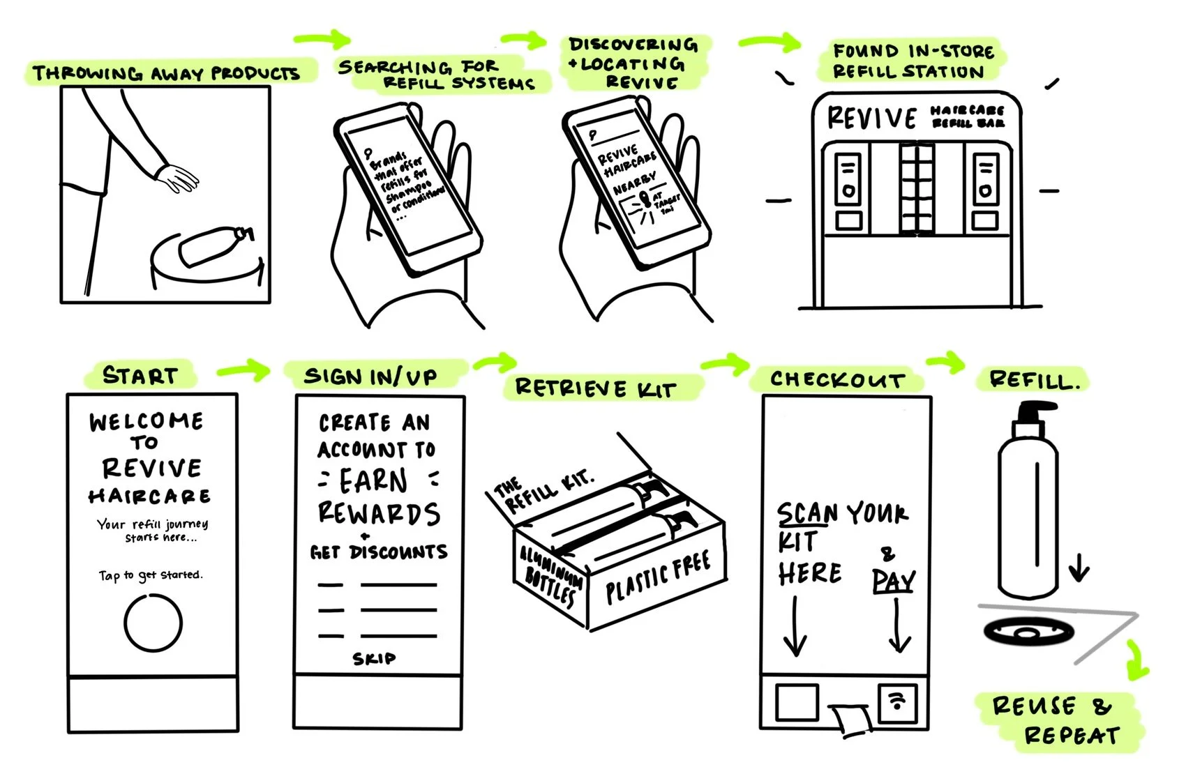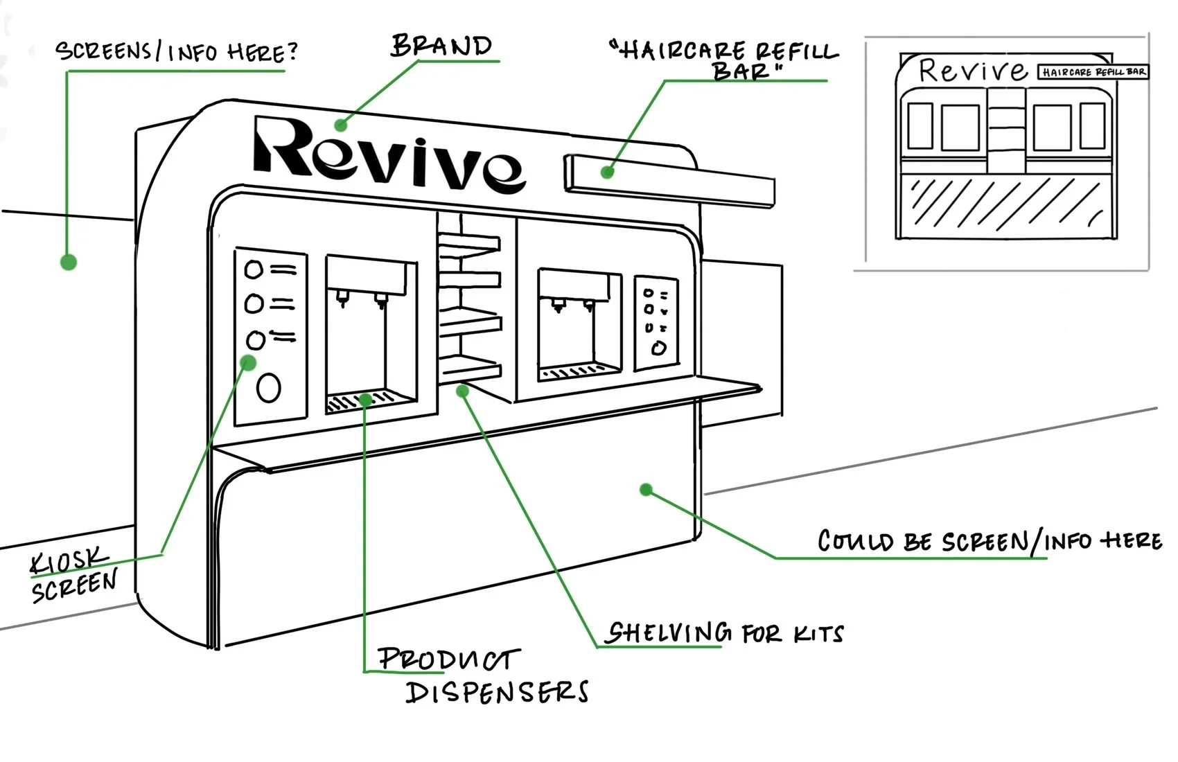 Revive offers an approachable, informative, and advanced, solution to refill shampoo and conditioner bottles at retail stores.
